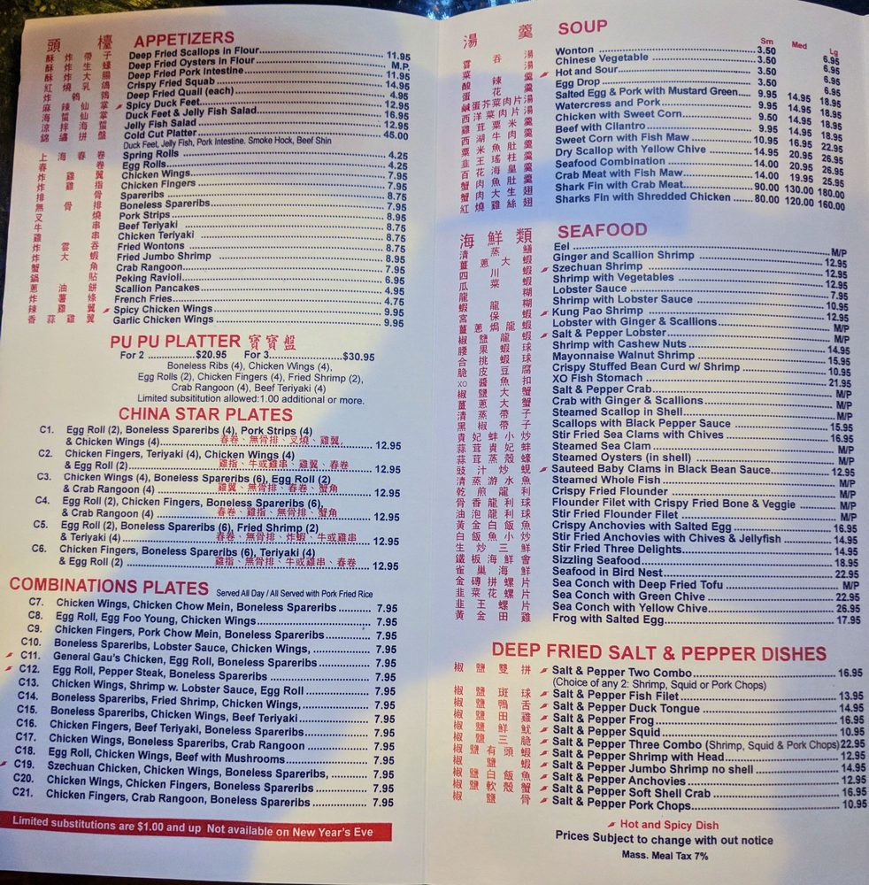 Welcome to China Star Dim Sum Lounge, your gateway to an authentic Chinese dining experience in Lowell, MA. The menu is a delightful exploration of traditional dim sum and hearty fare, designed to tantalize your taste buds. Start with their signature Peking Duck or savor the Fried Rice varieties, from Shrimp Fried Rice to Vegetable Fried Rice, each loaded with flavor. The Fried Noodles section also shines, offering generous portions of Seafood Fried Noodles and Shredded Pork Fried Noodles.